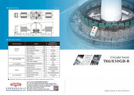 La Telar Circular está equipada con 6 lanzaderas o 8 lanzaderas (dependiendo de la demanda del cliente) y está especialmente diseñada para fabricar rollos de tejido tubular. Prueba nuestro nuevo Telar Circular de tipo banda, Modelo: TK-6/850GB-R, que mejora la capacidad de producción, ahorra más energía y es mucho más fácil de mantener y reparar en comparación con el Telar Circular de tipo leva anterior.